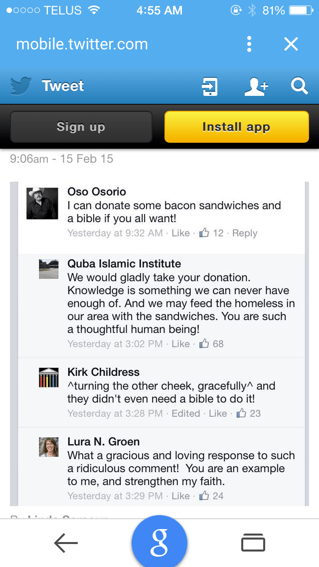Just a thought….. But it seems to me that the best way for Americans to counter the threat of extremism is to stop being extremist. That means to stop spreading hate and discontent so there is room for the moderate Islamic community to grow. It means finding common ground and it means interfaith solidarity. After all…… ISIS and Boko Haram haven’t just killed or enslaved Christians; they’ve destroyed the lives and freedom and religious sites of anyone who doesn’t prescribe to their brand of insanity. Let’s be better than that.