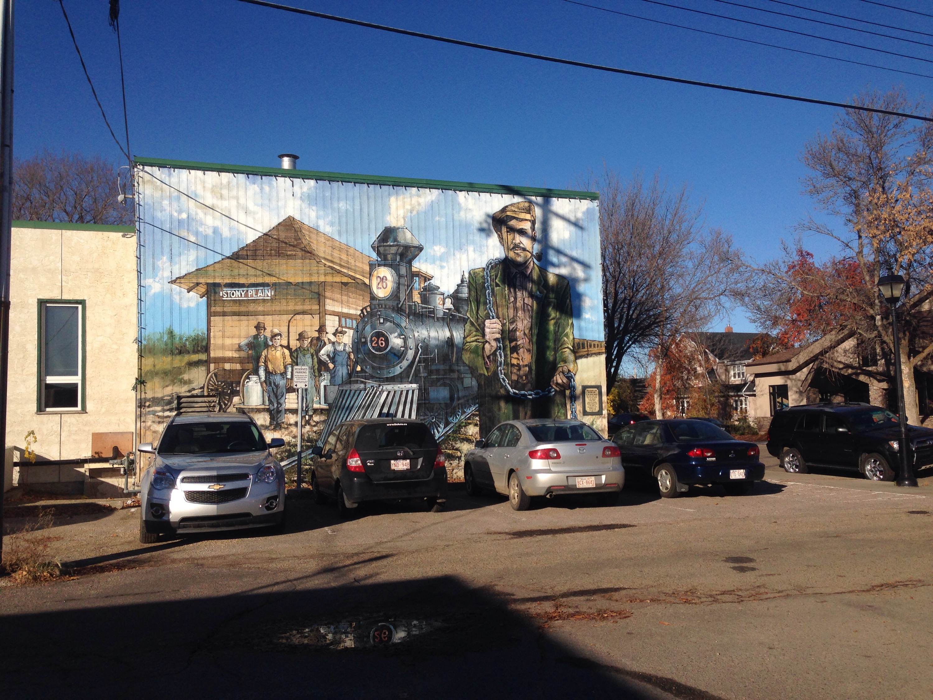 This is an artist’s depiction of Isaac Umbauch, Stony Plain’s first mayor and Sherrif. During his tenure he chained CN Rail’s trains to the track for nonpayment of rent, built the first jail (using his basement originally; I used to play in his house) and built the first one-room schoolhouse. There’s a statue of him with the legendary chain and a train wheel at Rotary Park by the Visitor’s Information Kiosk.
