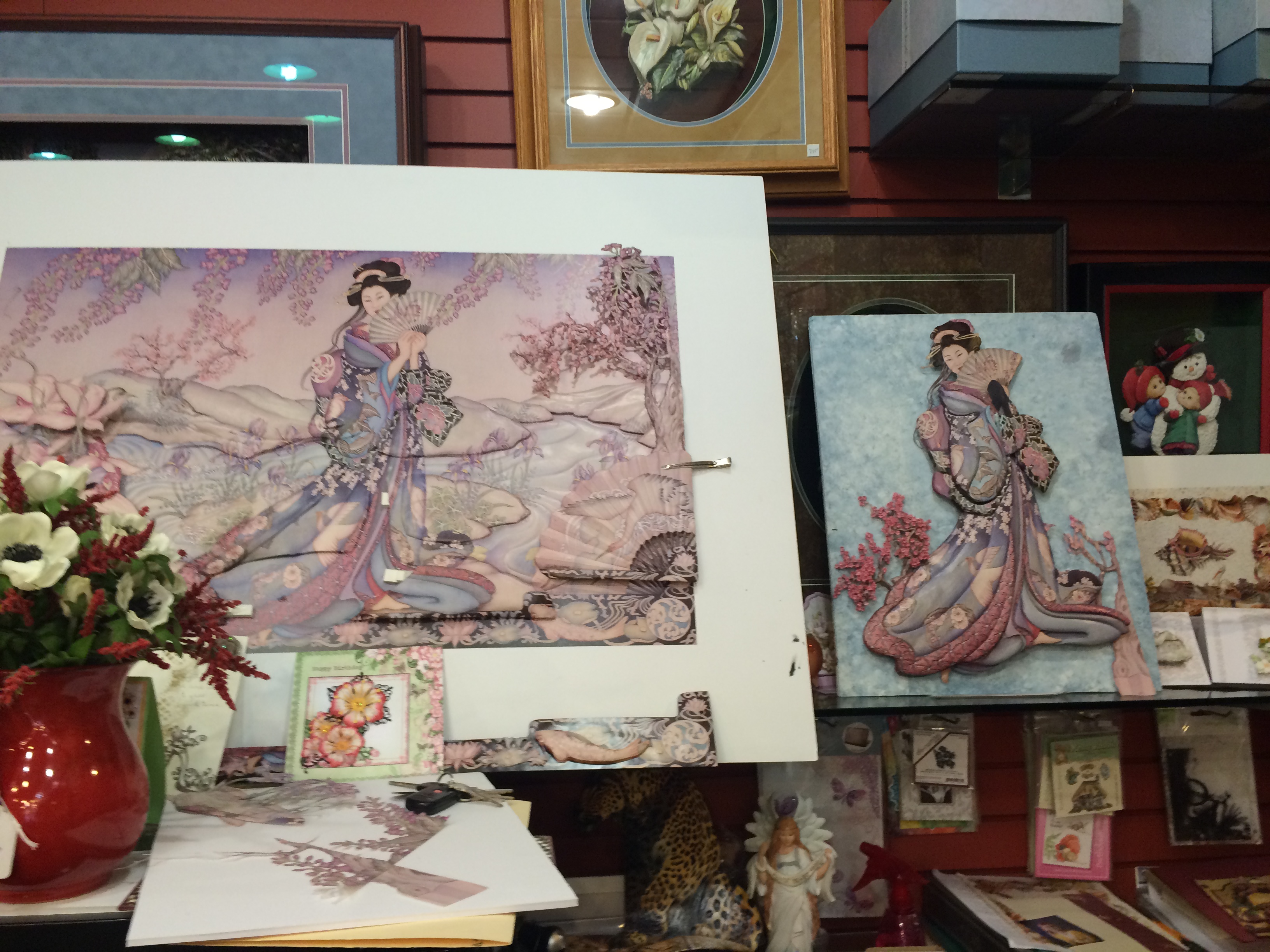 Evidently she offers classes in the art of tranforming paper prints in 1d into 3D gorgeous works of art. She has several samples of her work available in the shop, and its really so amazing that at first I thought they were done in bisque or porcelain perhaps. The classes are I think $180 a person to learn the fundamentals and basics, but she explained that the reality is that the project will take far longer than she offers classes for in order to master, and I can totally understand what she meant. She, however, is a true artist at the matter, and her works are utterly amazing. They range from forest stories to Asian classics rendered in full colour and movement, to hunting scenes, romance scenes, still life florals, etc.